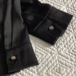 Stylish long sleeved black button-up top by Modern Works featuring shirt style collar, drawstring waist. This stylish top has silver coloured accent buttons down the front on the cuffs and on the two functional pockets. The fabric having a slight sheen to it makes this top perfect for casual or formal occasions.