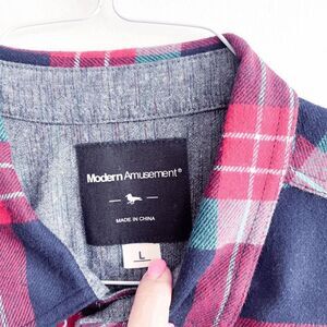 Stay comfy and stylish with this Modern Amusement shirt! This casual button front shirt is perfect for any occasion, and the long sleeves and plaid pattern make it ideal for cooler weather. The vibrant red colour adds a pop of colour to any outfit, while the large size ensures a comfortable fit. Whether you're running errands or heading out with friends, this men's shirt has got you covered.