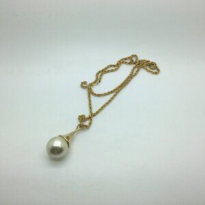 Vintage Modernist Faux Pearl Tear Drop Pendant Necklace Chain Gold Tone