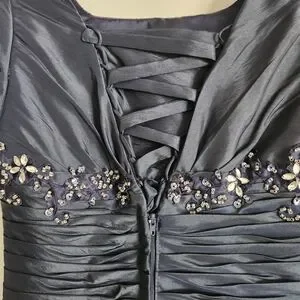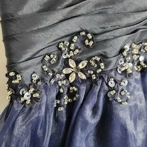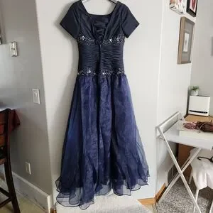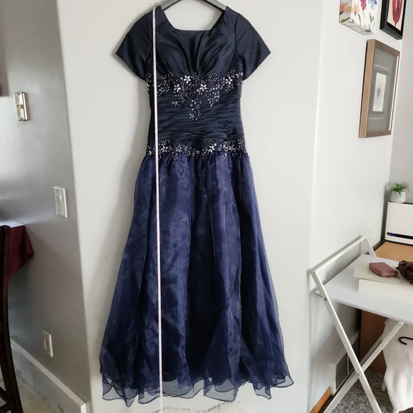 This modest navy blue graduation/ prom dress features a beautifully embellished bodice and a flowing skirt, perfect for special occasions.