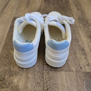 Stylish and comfortable sneakers in white and blue. Perfect for everyday wear. tiny brown spot on one shoe lace