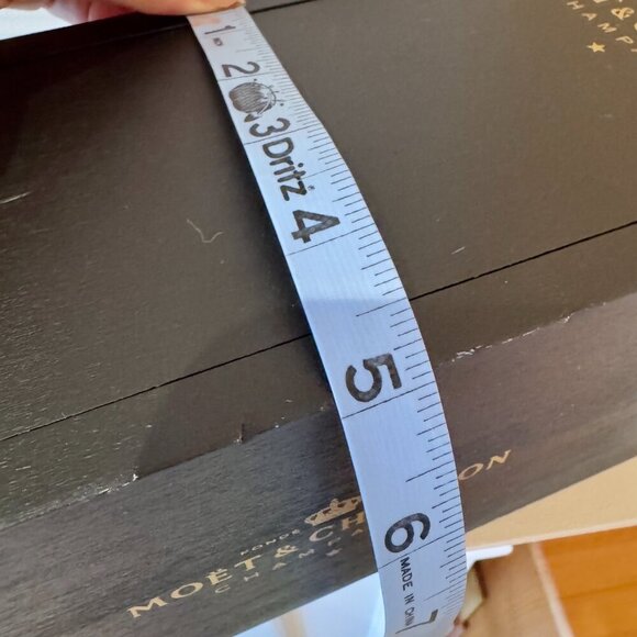 Moet & Chandon champagne/wine box, dark brown wood with gold/beige lettering. Measures 14 inches by 5 inches. Cat friendly, nonsmoking home.