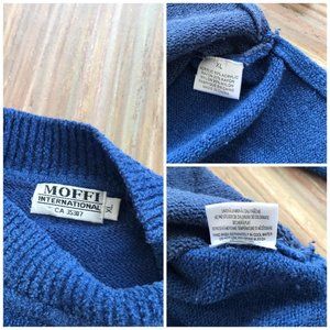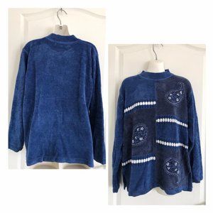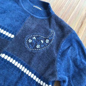 Vintage 90s blue chenille mock neck knit pullover sweater by Moffi International. Classic paisley pattern has embroidery & beaded accent detail Has side slits at hem. 50% acrylic/30% rayon/20% nylon.