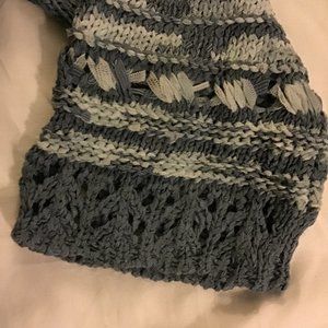 Pretty knit cardigan in a light denim blue with cream detail, lapels and big buttons on the front.