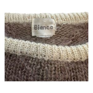 No tag on the sweater, but it is a Mohair/Acrylic blend fabric. It is a soft knit with some stretch to it.