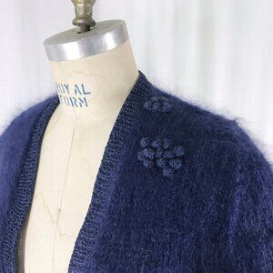 Cropped mohair cardigan sweater. No tags as it was handmade but lightweight deep blue yarn with a open weave and shaggy look so probably mohair/nylon blend. Trim is matching but smooth yarn with a bit of sheen and more tightly knitted - maybe rayon? Open front with a pompom or berry decoration at left chest and long sleeves. Length is cropped to waist - please go by measurements below to determine fit.