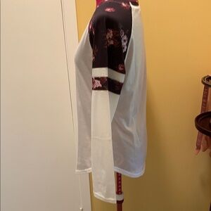 Elevate your casual wardrobe with this chic long sleeve top featuring elegant floral accents. The classic white and black combination offers versatile styling options.