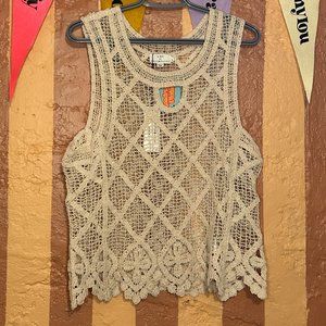 This beige crochet round neck sleeveless inspired top featuring frill hemline and diamond decoration is ideal for layering.
