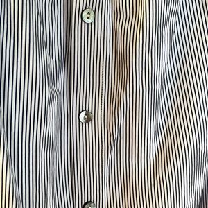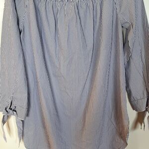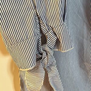 Chic blue striped shirt with mock button-down design. Features long sleeves with beautiful ties and a relaxed tunic fit. Ideal for versatile styling. Very lightweight and perfect to pair with white or navy bottoms.