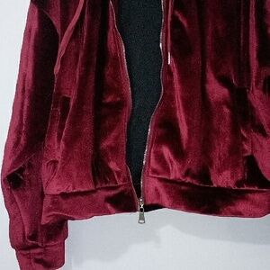 Elegant velvet hoodie in deep wine red. Features a convenient zip-up design.
