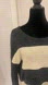 Molly Bracken, light weight, 3/4 length sleeve, Charcoal Grey & Cream Striped Sweater in a loose & Boxy style. Neck is a wide scoop neck fit. Style is sweater the Front of sweater is a little shorter then back