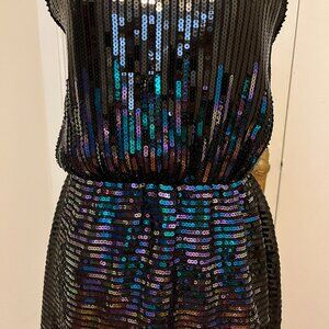 This stunning Molly Bracken sleeveless dress is covered in shimmering black sequins that flash blue, purple, and teal under the light. With a flattering blouson bodice and lightly flared skirt. Unlike fitted cocktail dresses, very comfortable to wear but still has the dazzle factor.