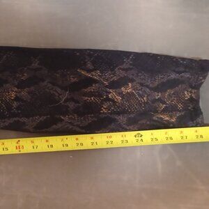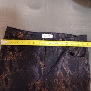 Slim fit ankle-length jean-style pants in a subtly metallic bronze on black snakeskin print. Size XL. Viscose/polyamide blend with comfortable stretch. Zipper fly. Excellent condition. Measurements in photos are unstretched. Waist stretches to approx. 17.5" laid flat, and hips stretch to approx. 21" laid flat.