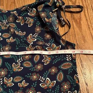 Elegant blouse with floral pattern. Features navy and teal colors. Perfect for any occasion. Shoulders are cinched up with a tie with elegant metal ends. Very light weight material. In excellent condition.