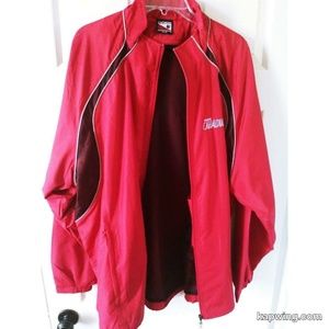 Lightweight 100% Polyester jacket, inside pocket and pull tie to tighten bottom of jacket if needed.