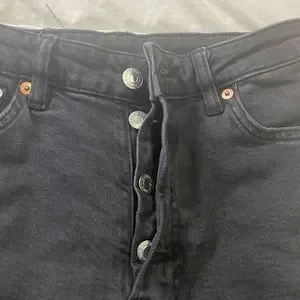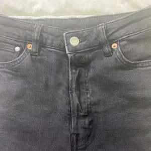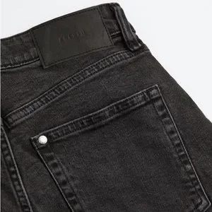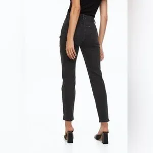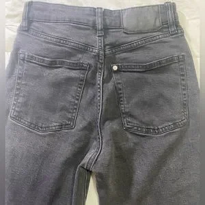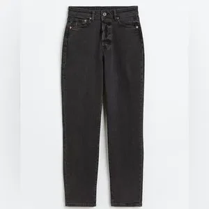 5-pocket, ankle-length jeans in washed stretch cotton denim. Extra-high waist and straight legs. Slightly looser fit. Cotton content is partly recycled.