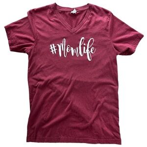 Elevate your mom style with this pre-owned women's t-shirt in size medium! Crafted from a blend of 52% cotton and 48% polyester, this burgundy t-shirt offers both comfort and style. The v-neck design adds a touch of femininity, while the front features the trendy "#momlife" in white script text.