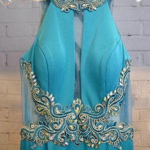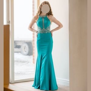Perfect for any formal occasion, including prom! Featuring a mermaid-style skirt and high neck, this gorgeous gown has a stunning beaded back and fitted silhouette. The sheer panels along both sides and middle of the bodice reveal just the right amount of skin and the jersey material is comfortable for wearing all night.