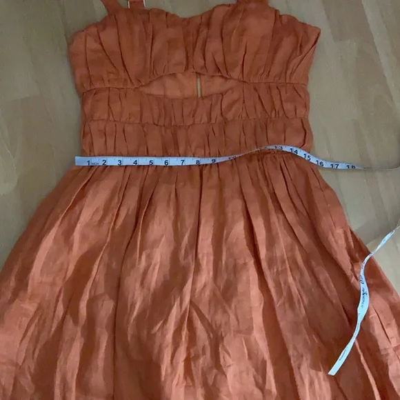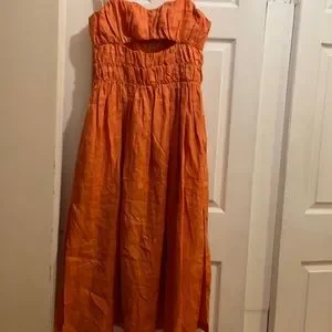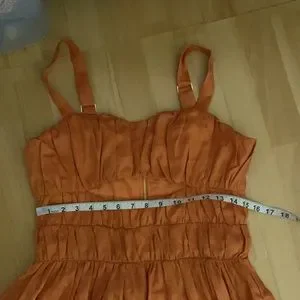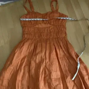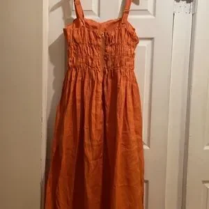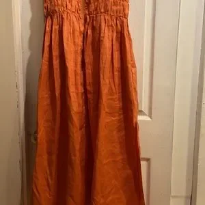 Thick high quality linen, cotton lining, adjustable straps, colour similar to actual on first pic, can’t capture the colour. Absolutely stunning, sides pockets