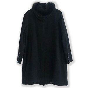 Elevate winter style with the Mona Lisa Fen-Nelli Black Wool Coat. Luxurious Wool Cashmere blend, faux-fur hood, and a removable scarf for chic versatility. Button closure, two pockets, and Canadian design. New with tags—seamless sophistication for the season!