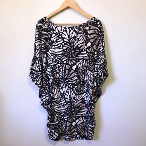 Very good preowned condition, long, punkish, short dolman sleeve (very unique cut), ruched waist, wide rounded collar top by AdditionElle, featuring a monarch butterfly wing inspired, batik style pattern in black, white and tan. So beautiful. It honestly looks like monarch butterfly wings. And with the dolman sleeve it adds another layer of meaning. Honestly so cool. The ruched waist offers a feminine fit, but would look even more flattering with a plain black obi style belt with tassels.