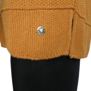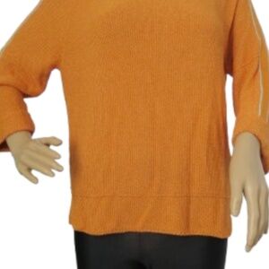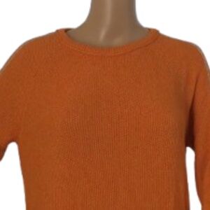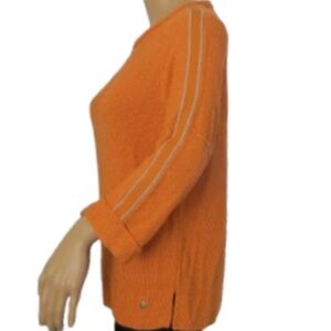 This sweater is a perfect fusion of casual elegance and sporty chic. Crafted from a rich, textured knit fabric, it offers a soft, cozy feel with a slightly structured drape that flatters the silhouette without clinging. The crew neckline is gently rounded, sitting comfortably at the collarbone. The standout feature of this sweater is its sleeves, which are designed with a relaxed drop-shoulder seam, emphasizing a laid-back vibe. Along each sleeve runs a striking double-stripe accent in a contrasting lighter shade, adding a subtle sporty flair while elongating the arm visually. The sleeves are finished with neatly rolled cuffs. Along the hemline, discreet side slits provide additional ease of movement and a flattering fit over the hips, enhancing the sweater’s relaxed profile. A small metallic logo tag, delicately positioned just above the slit. The sweater’s straight-cut hem is finished with a ribbed knit band that anchors the silhouette, giving it a clean and balanced look. The vibrant burnt orange hue radiates warmth and energy, making it a standout piece that's still versatile enough to pair with both neutral and bold bottoms.