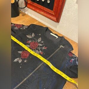 Black denim-look fabric with red rose embroidery and silver star accents on the front and sleeves. Asymmetrical zip closure, zippered side pockets, and a sleek structured cut. Tag missing — please refer to measurements for best fit.