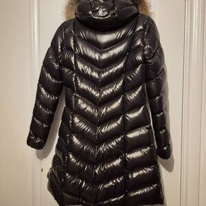 Down-filled coat featuring a chevron-quilted design, detachable hood trim and zip pockets.