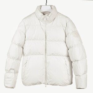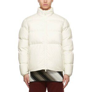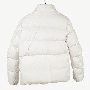 The Akishima jacket from Moncler's 2021 Autumn and Winter collection is crafted in a White quilted technical satin, and is insulated in a soft goose down. It features long sleeves with a tonal felted logo patch on the left, elasticized cuffs, a stand collar with a packable hood kept hidden with zip fastening, a two-way zip closure at front, concealed zippered pockets at the waist, a bungee-style drawstring at the inner hem, and is fully lined.