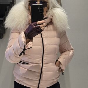 Stylish pink puffer jacket. Features a luxurious fur hood. Perfect for cold weather.