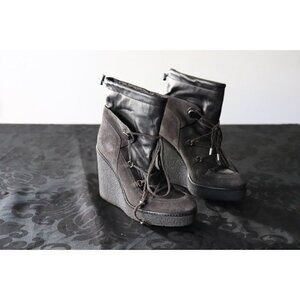 Moncler Women's Size 37 Black Wedge Boots Suede Lace Up Mid-Calf Round Toe Shoes
