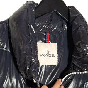 Quilted glossy nylon laqué with a tricolour colourblock panel design in navy blue, white, and red. Down filled. High padded collar with concealed snap-button attachment for an optional hood (the original hood is missing). Full-length two-way zip closure with branded Moncler white coated pullers. Two (2) side zip pockets. Signature Moncler logo patch at chest. Large chenille Moncler x Kith logo embroidery in tricolour detail at back. Large Moncler lettering embroidered across the back hem. Adjustable drawcord hem with branded toggles. Interior includes a tricolour grosgrain locker loop and Moncler’s comic strip label. Made in Romania.