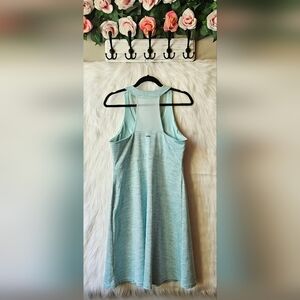 Summer absolutely requires this elegant sleeveless athleisure dress in light blues, with a chevron pattern by Mondetta. A textured design and a flattering V-neckline, and a mesh insert in the racerback straps. Padded, and you can swap out for your choice of pads or remove them completely (insert holes shown).