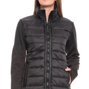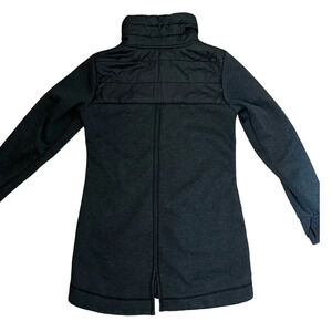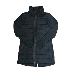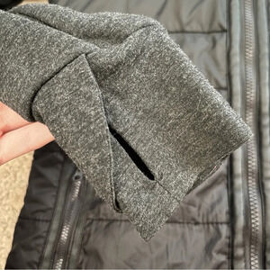 Insulated puffer part is black Sleeves and the back are a charcoal grey Has Thumb-hole cuffs P2P: 18” L: 28.5”