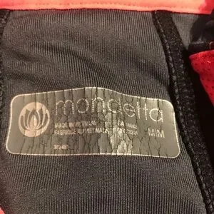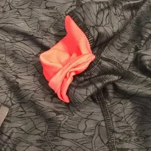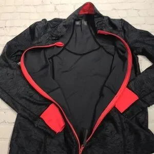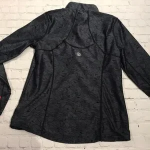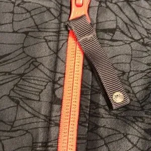 Dark grey print running jacket with coral accents. Cuff thumb holes. Front pockets.