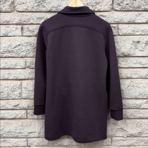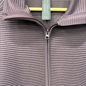 Elegant plum jacket with ribbed texture. Features a convenient zip closure.