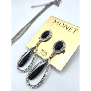 Elegant vintage Monet demi-parure jewelry set, new on original card. Features a necklace with multi-strand silver-tone chain and teardrop pendant with faceted black stones framed by sparkling rhinestones. Matching clip-on earrings complete the look, still on Monet’s gold display card. Timeless and versatile, perfect for evening wear or collectors of signed vintage costume jewelry. Necklace approx. 18" + extender; earrings 2.25" drop. Both pieces marked Monet. Excellent condition, unused, with brilliant sparkle.