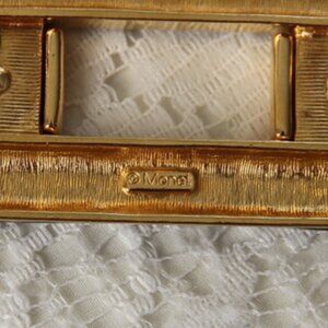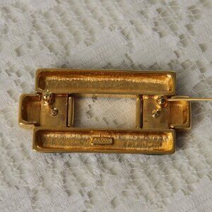 Large rectangular brooch by Monet. Gold tone metal on front has light scuffs, but still looks great. Clasp and pin are in good condition.