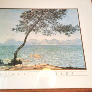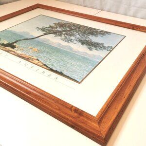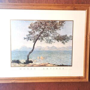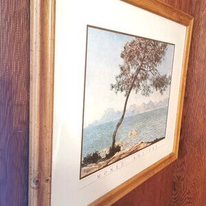 Selling a beautiful, large framed print of Claude Monet’s famous Impressionist painting, Cap d'Antibes, Mistral. The artwork features the iconic leaning pine tree overlooking the French Mediterranean.