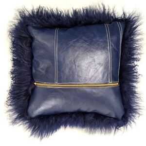 Dark navy/royal blue Mongolian Fur pillow with dark blue leather backing. Heavy duty zip for in & out.