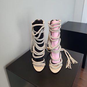 One of this brand's bestselling gladiator sandals, the "Imena II" is carefully crafted in braided nude leather and silver chains that wrap effortlessly up the leg. The tassels finish off this style perfectly and the silver zipper along the back makes for easy fastening and removing. Make a statement by the pool, on the beach or for a night out, subtle nude color and detailed crafting will be sure to turn heads. Very lightly worn, no scuffs or tears on leather, heel near perfect. Material: Nude calfskin leather ("Putty"), silver chain, silver zipper. Heel height: 4.5 inches Origin: Made in Italy. Comes with original box and protective shoe bag.