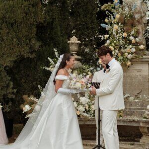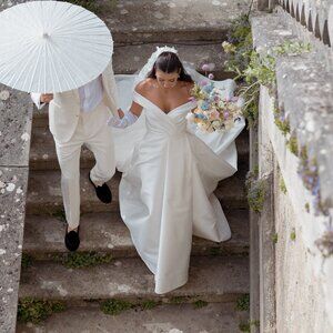 This Monique Lhuillier gown is truly one of a kind—a stunning blend of timeless elegance and modern style. Made from a beautiful white silk, this gown drapes beautifully off the shoulders, creating a flattering neckline that makes you feel both graceful and effortlessly glamorous. The floor-length silhouette has just the right amount of drama, while still feeling light and comfortable for the entire day.