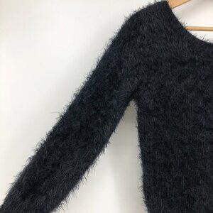 Monk & Lou Black Eyelash Knit fuzzy soft sweater scoop or V neck 3/4 sleeve XS