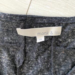 super cute top with a seam up the back. Barely worn because I'm not a jeans girl, and these are meant to be worn with jeans imho. Very light, full sleeves, a dark heathered grey. Bought from Plenty (monk and lou is their house brand)