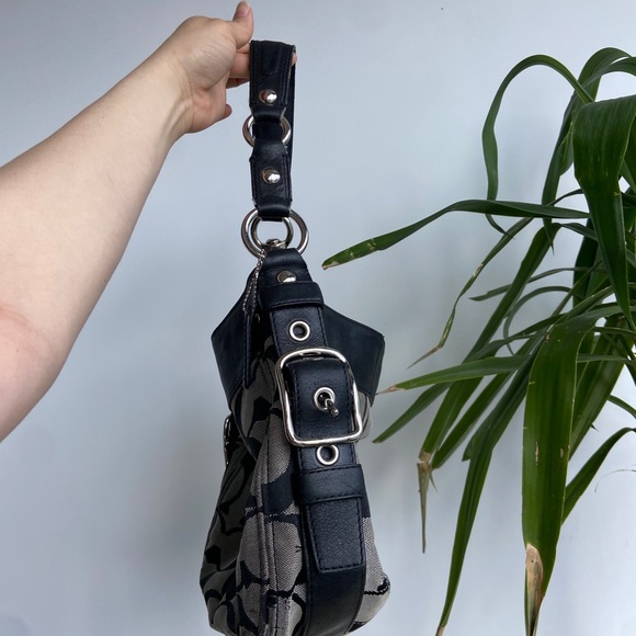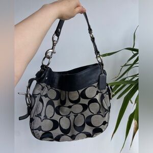 Monogram black Coach bag with side buchones in good condition.