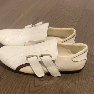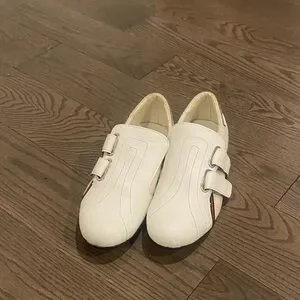 Elegant white sneakers featuring Velcro straps. Subtle black accents add contrast. Perfect for casual wear.