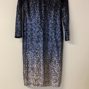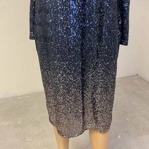 Monsoon Sequins Ombré Navy Blue V-Neck Long Sleeve Midi Cocktail Dress, Size M