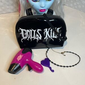 Added Dolls Kill makeup bag to hold extra accessories including 2 black heart kids choker necklaces, pretend hair blower & purple heart brush