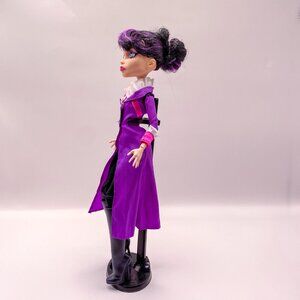 Iconic Headless Headmistress Bloodgood in her full purple coat, ruffled collar, tie, pants and tall black boots. The head detaches and reattaches smoothly. Black Monster High stand is included (as shown).