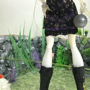 Monster high spectra with fur vest (Black and purple), wearing a purple dress with black lace and a black and gold cheetah print skirt. She holds a silver disco ball purse and wears black knee high boots with yellow lightning bolts.